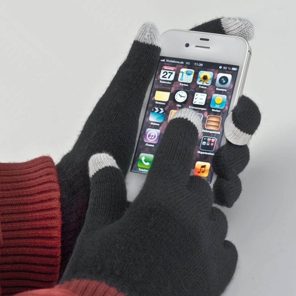 Rękawiczki z miękkiego akrylu. W miejscu kciuka i palca wskazującego wykonane są ze specjalnego tworzywa, dzięki któremu można obsługiwać w nich ekrany dotykowe.