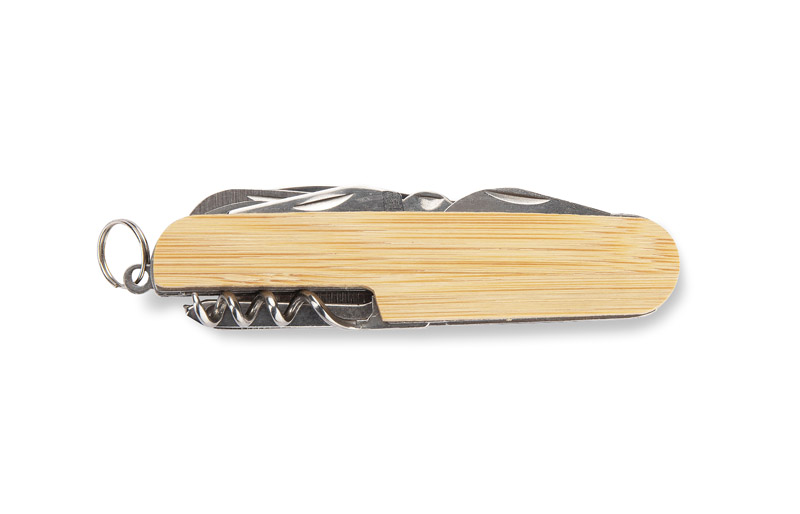 Scyzoryk KANA z bambusową rękojeścią wyróżnia się unikalnym, naturalnym wyglądem. Wyposażony w funkcje przydatne na co dzień i w terenie: nóż, piłę, skrobak do ryb, otwieracz do puszek i butelek, śrubokręt, korkociąg, szydło, dziurkacz do skór oraz kółko do kluczy. Praktyczny gadżet reklamowy, który sprawdzi się w każdej sytuacji.