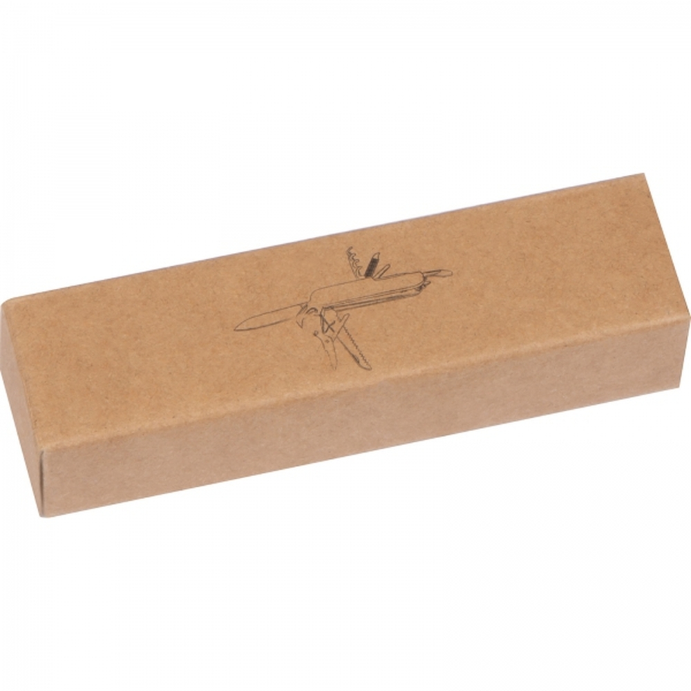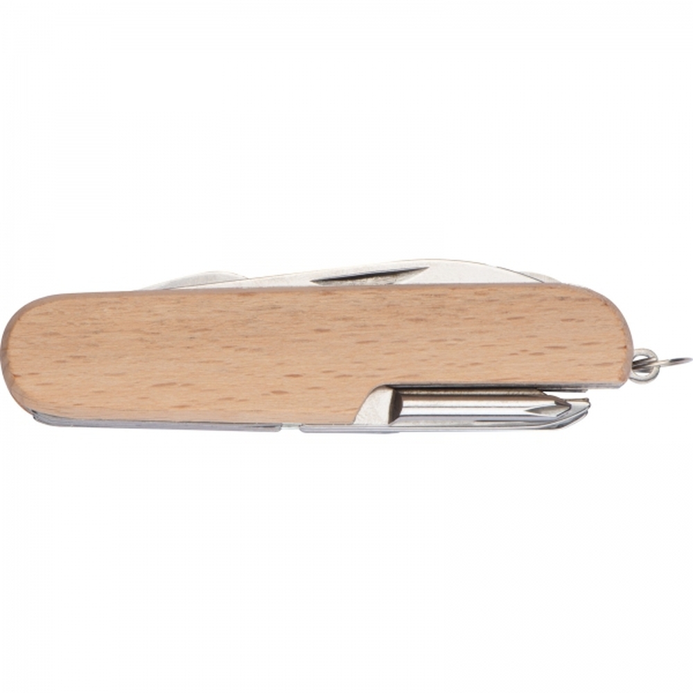 Scyzoryk z 11 funkcjami, wykonany ze stali nierdzewnej, w drewnianej obudowie. Posiada m. in. 2 piły, nożyczki, otwieracz do butelek i puszek, korkociąg, tarnik i śrubokręt.