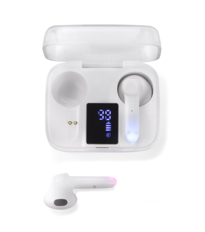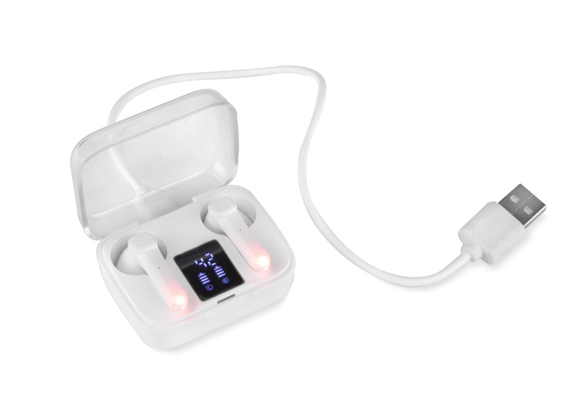 Słuchawki bezprzewodowe TRUVI to kompaktowych rozmiarów słuchawki douszne zapakowane w poręczne etui, które pełni jednocześnie funkcję akumulatora i umożliwia doładowanie urządzenia. Wyświetlacz LED pokazuje aktualny stan naładowania zarówno baterii w etui, a także każdej słuchawki. Dotykowe sterowanie słuchawek zapewnia wygodę użytkowania. Słuchawki posiadają wbudowany mikrofon, co pozwala na prowadzenie rozmów. Możliwość używania tylko jednej słuchawki. Dane techniczne: wersja Bluetooth: V5.1, częstotliwość Bluetooth: 2,4 – 2,48 GHz, zasięg Bluetooth: do 10m, pojemność baterii w każdej słuchawce: 30 mAh, pojemność baterii w etui: 300 mAh, czas pracy do 3 godz., czas czuwania: 300 godz.
