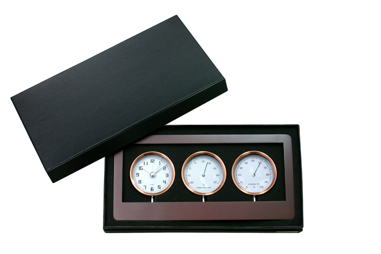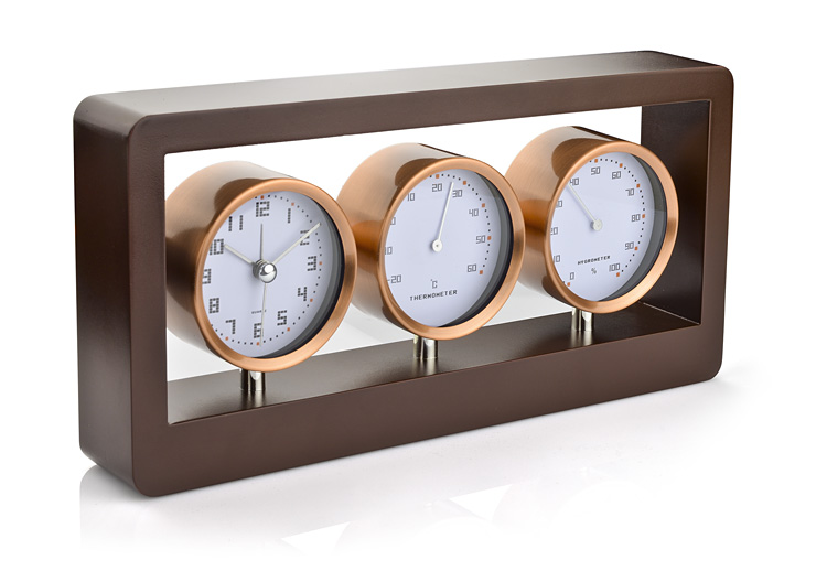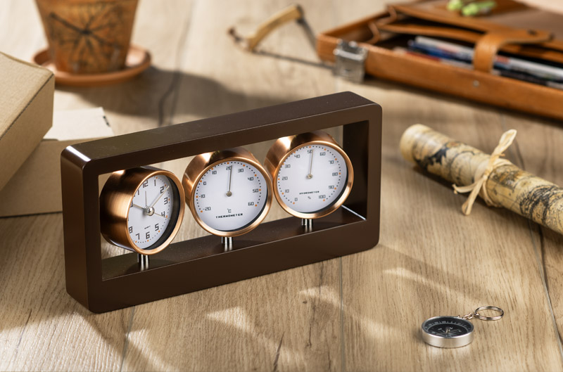 Zegar z funkcją budzika, termometr i higrometr przymocowane do drewnianej obudowy. Wymaga baterii: AA x 1 szt. Bateria nie dołączona.