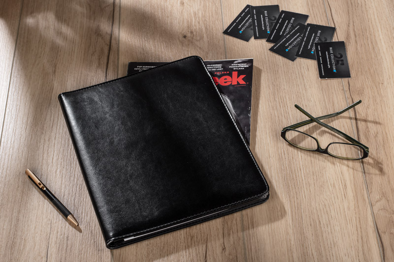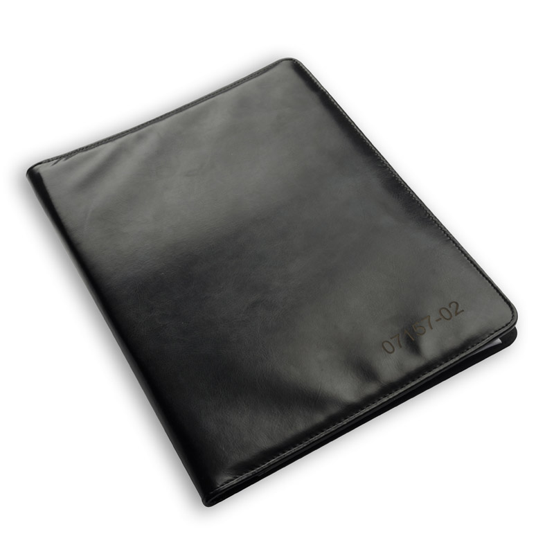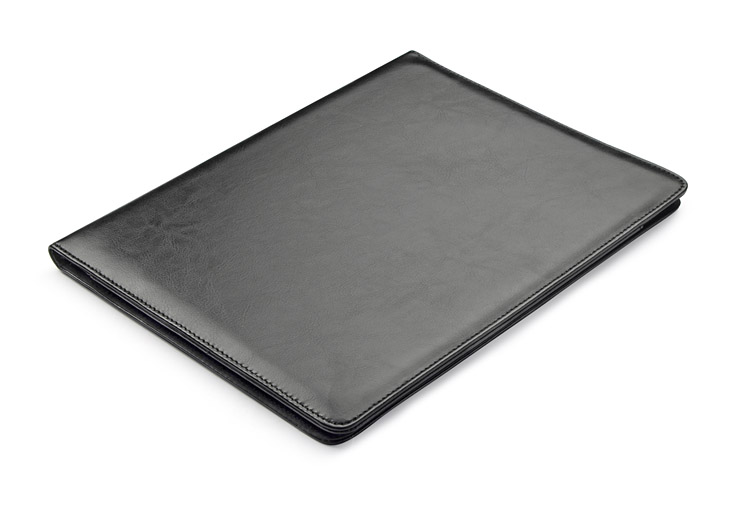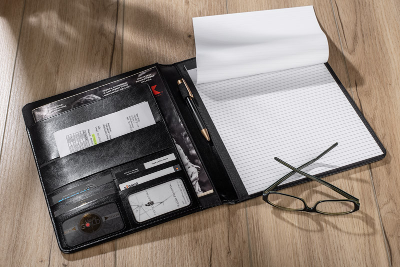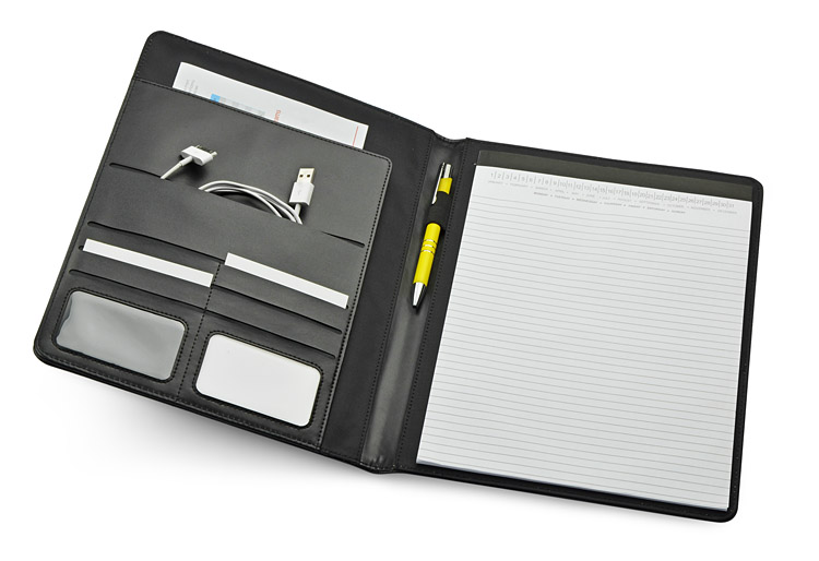 Elegancka, klasyczna teczka wykonana z materiału skóropodobnego (PU). Wewnątrz 1 duża kieszeń na dokumenty, 1 średnia kieszeń oraz 6 małych kieszonek np. na wizytówki. Wyposażona jest w notes w linie (20 kartek A4). Notes nie jest umocowany na stałe, ale wsuwany w kieszonkę, dzięki czemu można go łatwo wymienić. Logo można wykonać wieloma technikami na powierzchni teczki.