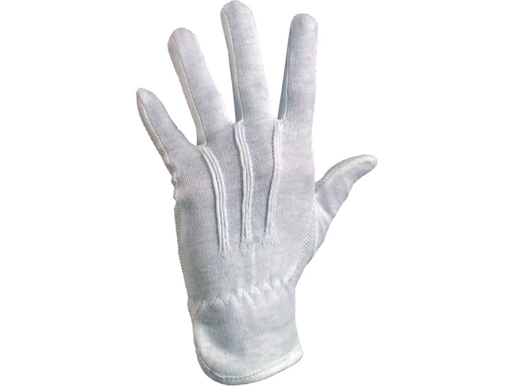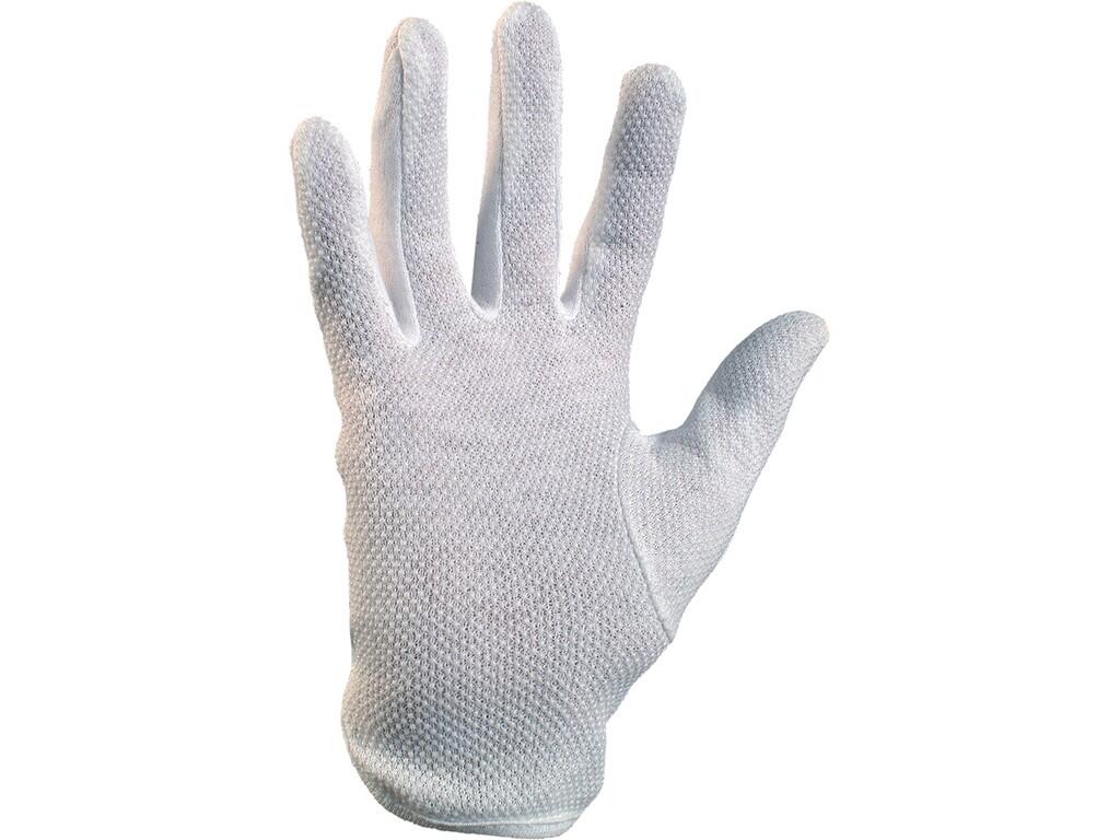 Tekstylne rękawice szyte z bielonej dzianiny bawełnianej, styl fourchette, PCV nakrapianie w dłoni, gumka w nadgarstku. Zalecane zastosowanie: magazyn, manipulacja z lekkimi lub drobnymi przedmiotami, lekki montaż.