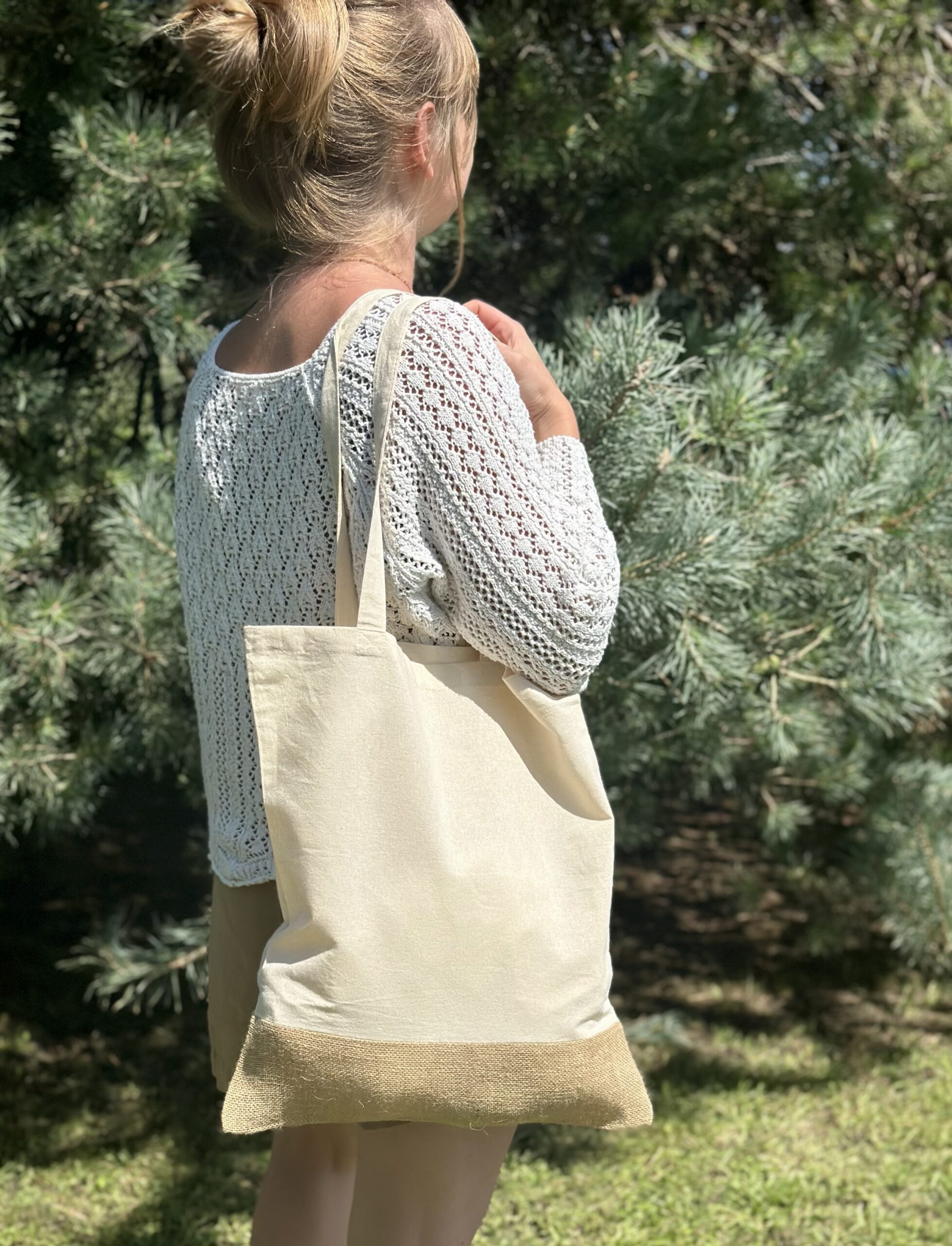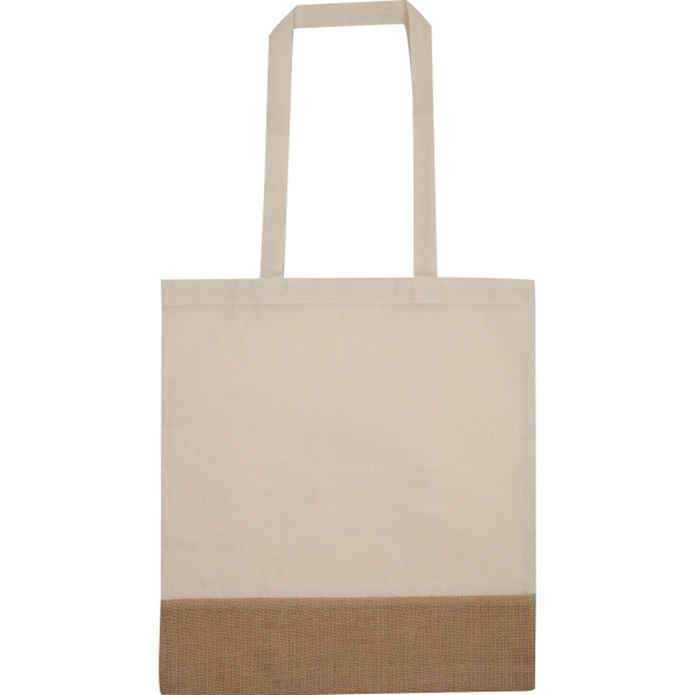 Torba bawełniana z dodatkowym, jutowym wzmocnieniem na dole torby to idealna pozycja dla osób, które poszukują w pełni ekologicznych gadżetów reklamowych. Wyposażona w dwa długie uchwyty, pozwala na wygodne i poręczne noszenie zakupów na ramieniu. Dodatkowo torba wykonana jest z w pełni organicznych materiałów, dostosowanych do kontaktu z żywnością i ze skórą.