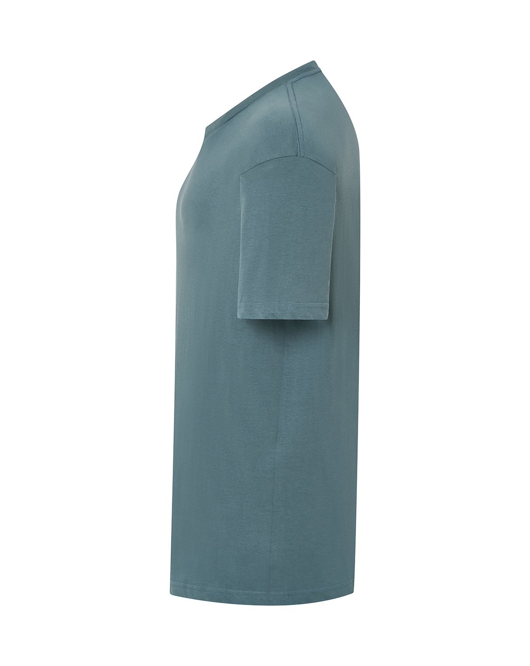 T-shirt męski z krótkim rękawem. Brak bocznych szwów. Podwójne szwy na ramionach. Wzmocniony lycrą ściągacz. Taśma wzmacniająca. 100% bawełna stabilizowana.