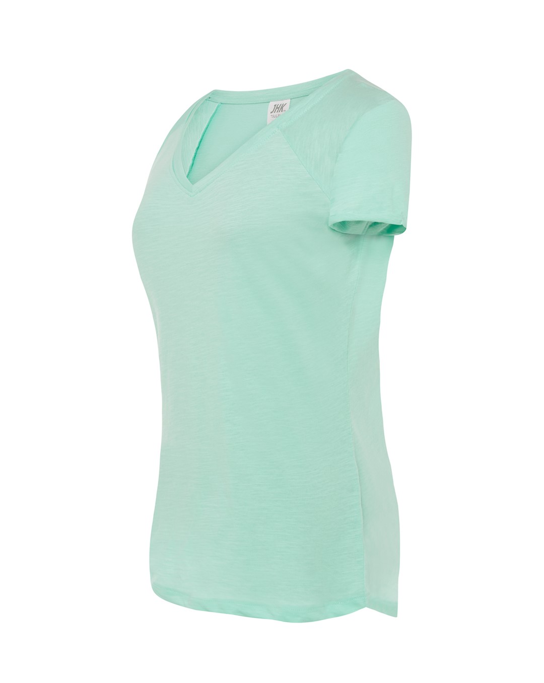 Damski Tshirt z rękawkami typu reglan. Single jersey, rękawki zawinięte. Modny niski ściągacz typu V-Neck. 100% bawełna.
