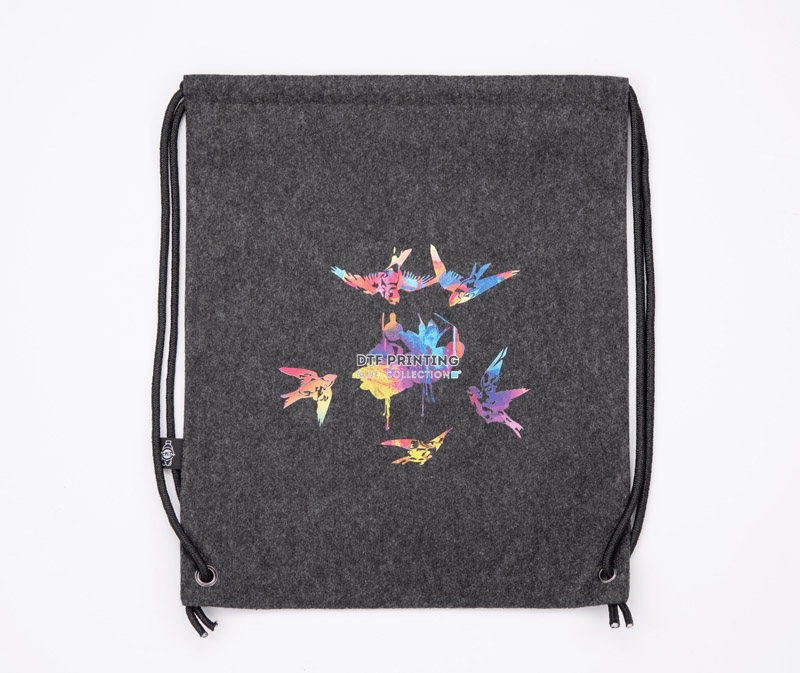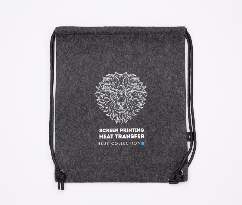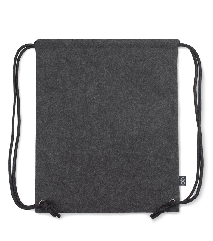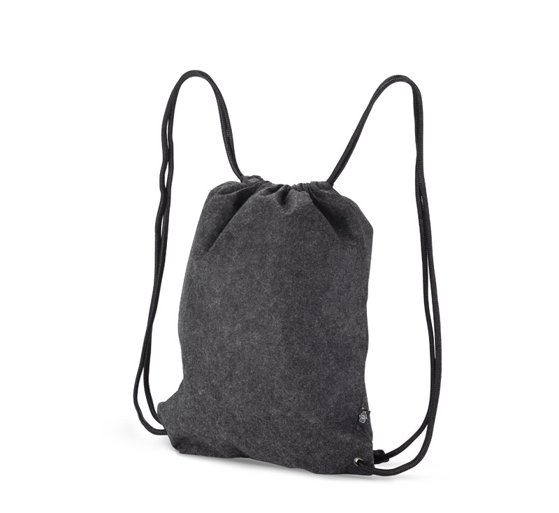 Worek DENGY wykonany z recyklingowanego filcu rPET w grafitowym, neutralnym kolorze. W połączeniu z czarnymi sznureczkami i uchwytem prezentuje się niezwykle ciekawie.