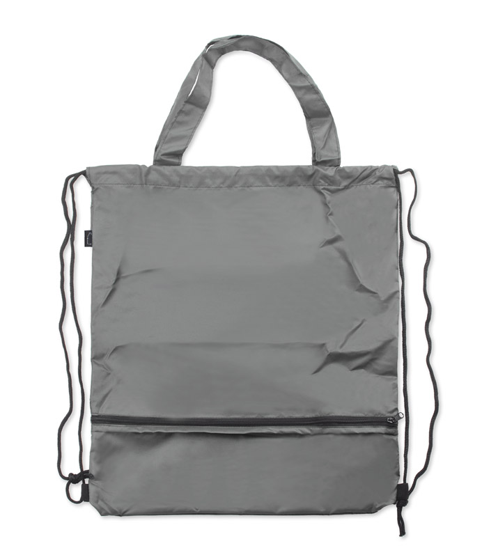 Worek na sznurkach z parasolem RAINY wykonany jest z poliestru RPET, co czyni go bardziej przyjaznym środowisku. Środek worka jest jednokomorowy. Oprócz tradycyjnych sznurków posiada jeszcze rączki o długości 44 cm, dzięki czemu może być używany także jako torba na zakupy. Na dole worka znajduje się zamykana na zamek kieszeń, w której schowany jest dołączony do zestawu parasol, także wykonany z poliestru RPET.