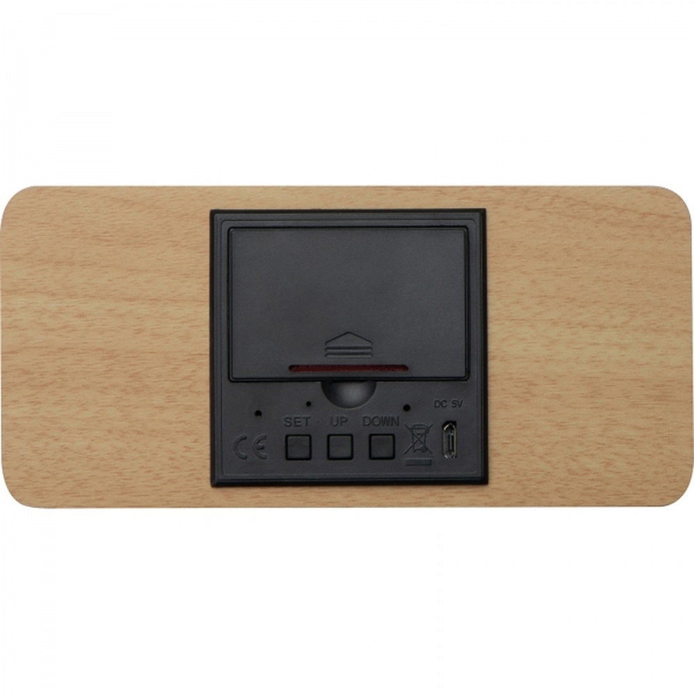 Elegancki zegar na biurko, wykonany z połączenia drewna i tworzywa sztucznego. To stylowy i funkcjonalny dodatek do każdego miejsca pracy. Jego podświetlany wyświetlacz wyraźnie wskazuje godzinę oraz aktualną temperaturę powietrza, dzięki czemu zawsze będziesz na bieżąco z czasem i warunkami w pomieszczeniu.