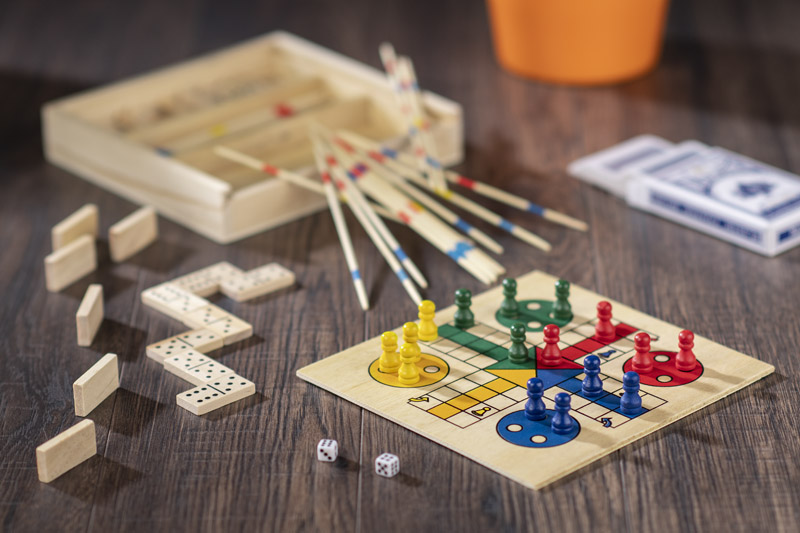 Zestaw gier w praktycznym drewnianym pudełku. Zawiera cztery różne gry: domino, bierki, grę planszową „Chińczyk” oraz talię kart. Logo wygrawerujemy na pokrywce pudełka.