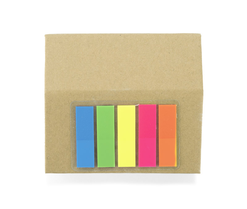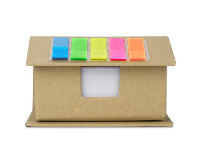 Ekologiczny pojemnik na karteczki ( 370 szt.) w kształcie domku. Dodatkowo znaczniki samoprzylepne w pięciu kolorach (po 25 znaczników w każdym kolorze). Logo wykonamy na powierzchni dachu.Układ poszczególnych kolorów karteczek w ramach jednej partii może się różnić.