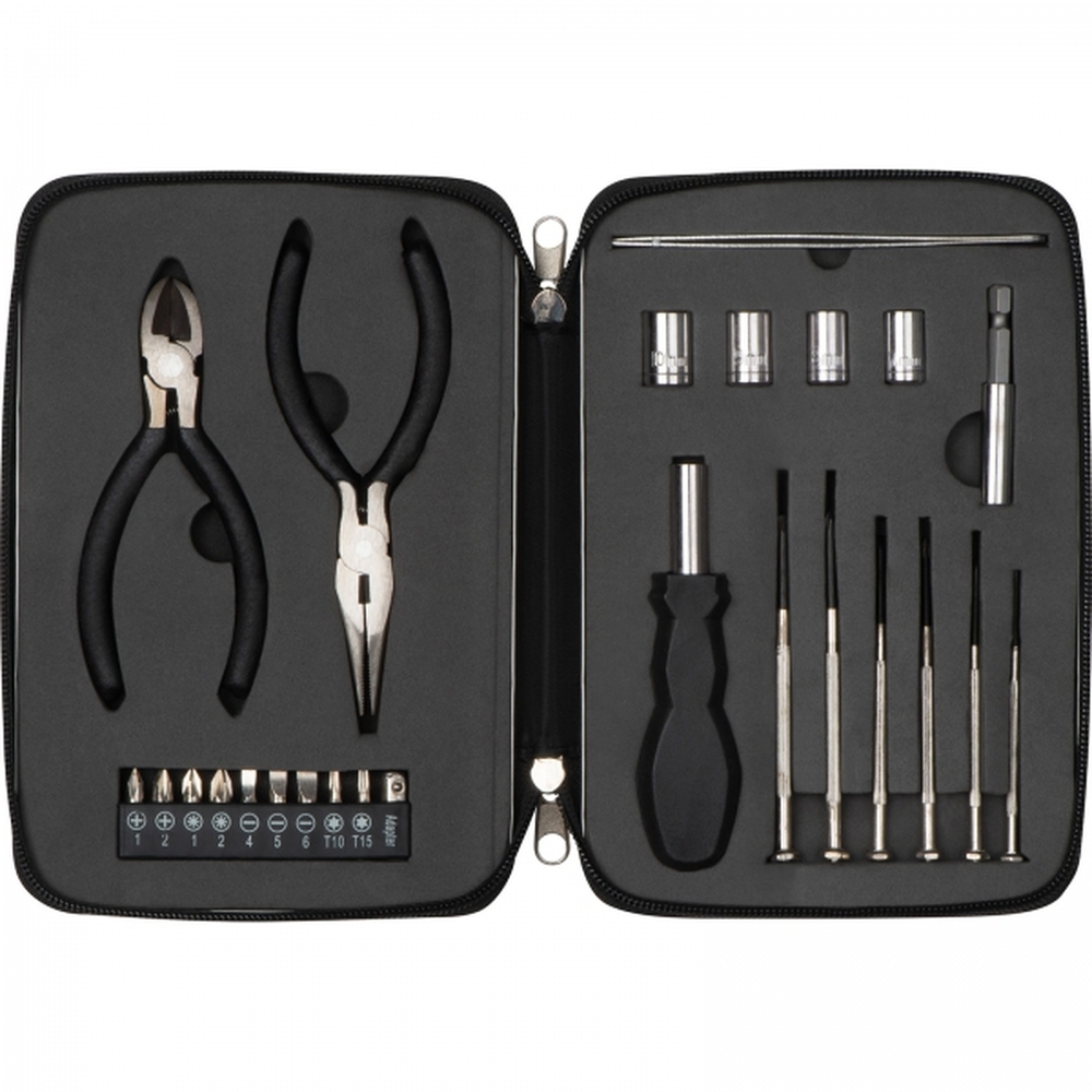 25-częściowy zestaw narzędzi w aluminiowym etui zamykanym na zamek, zawiera m.in.: szczypce, obcinaczki, zestaw wkrętaków precyzyjnych, uchwyt do bitów i nasadek, przedłużkę.