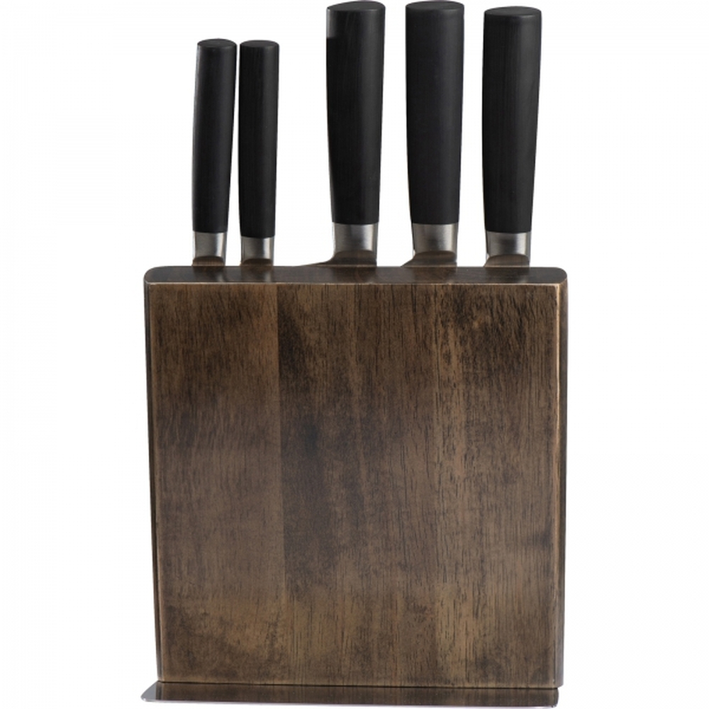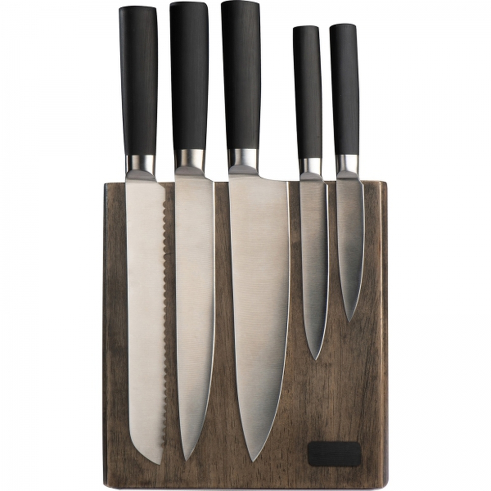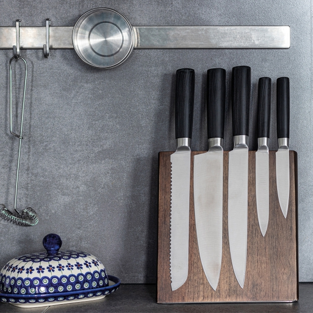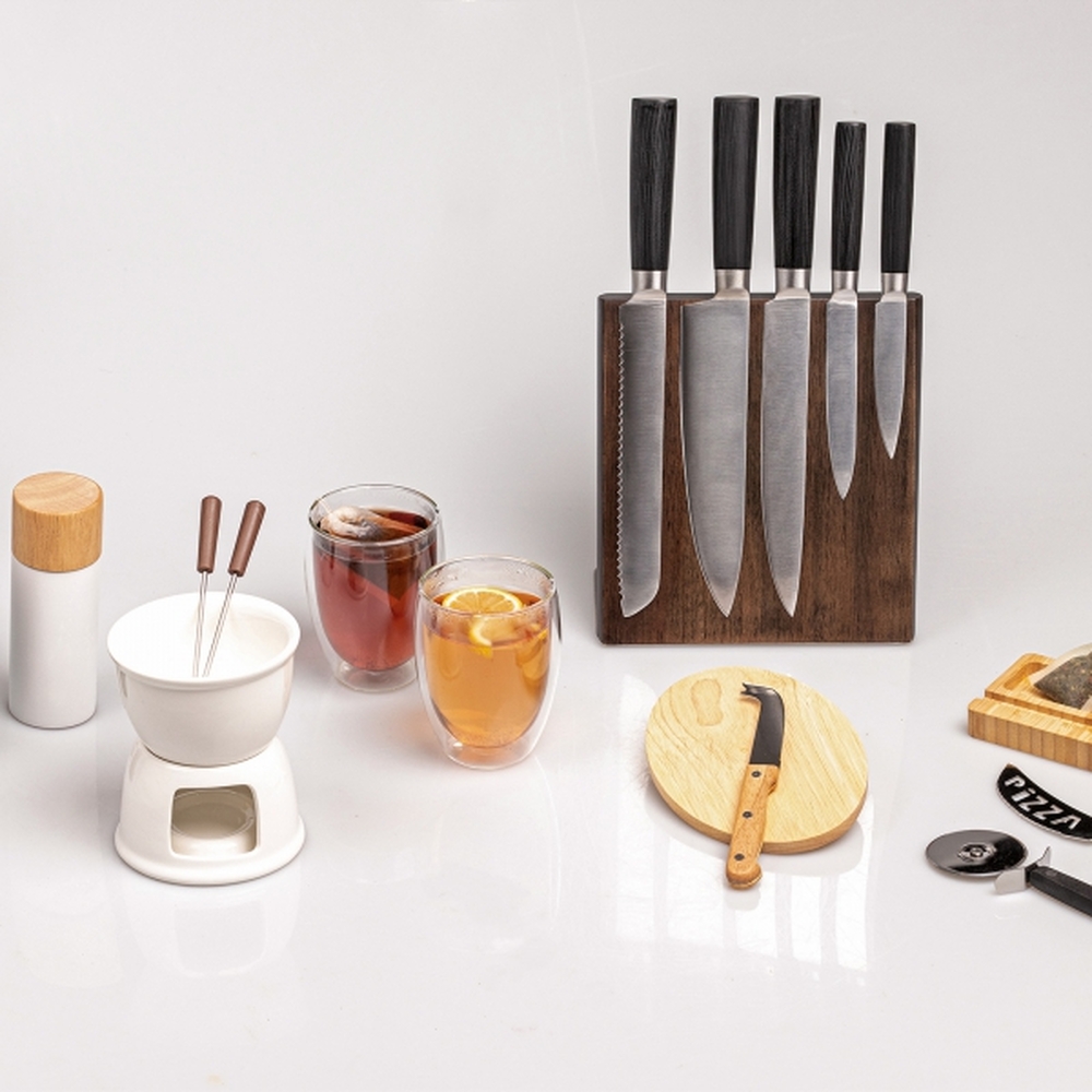 Ich dodatkowym atutem jest innowacyjne rozwiązanie drewnianego stojaka z wbudowanym magnesem wewnątrz drewna, które sprawia, że noże stabilnie trzymają się na swoim miejscu, co ułatwia ich szybki dostęp i organizację. To idealny gadżet dla branży gastronomicznej, hotelarskiej i nie tylko. Dzięki zamieszczonej na stojaku metalowej plakietce, na stojaku można zamieścić logo dowolnej marki, by dyskretnie promować firmę.