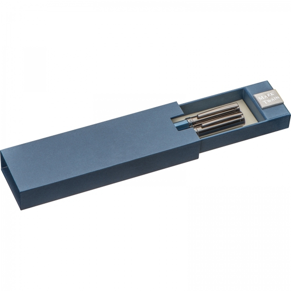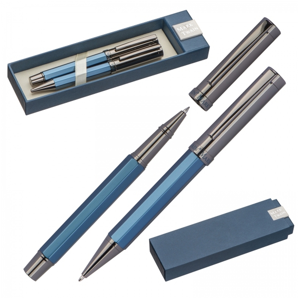 Elegancki zestaw piśmienniczy marki Mark Twain to połączenie klasyki i nowoczesnego designu. Składający się z długopisu i pióra kulkowego, zestaw ten wykonany jest z solidnego metalu, co nadaje mu odpowiedni, zbalansowany ciężar i trwałość. Korpusy o unikalnym sześciokątnym kształcie świetnie leżą w dłoni, zapewniając wygodę podczas pisania.