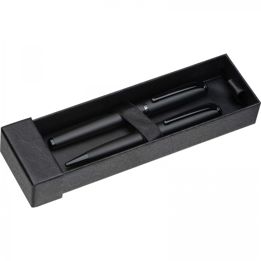Zestaw piśmienniczy marki Mark Twain, składający się z długopisu z mechanizmem obrotowym z wkładem w kolorze niebieskim oraz pióra kulkowego piszącego na czarno. Oba przyrządy mają czarną, matową obudowę oraz błyszczące czarne wstawki. Pakowane w etui wyściełane satyną.