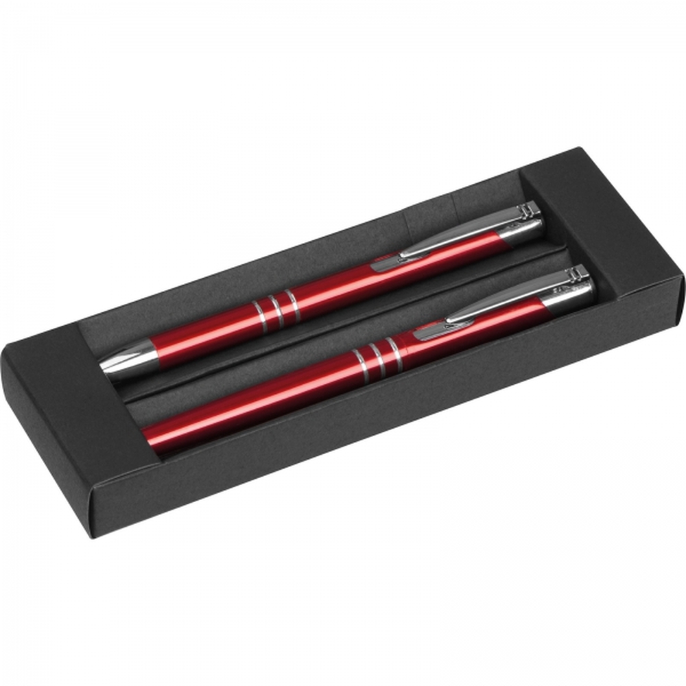 Zestaw z metalu i aluminium, składający się z piszącego na niebiesko długopisu i pióra kulkowego.