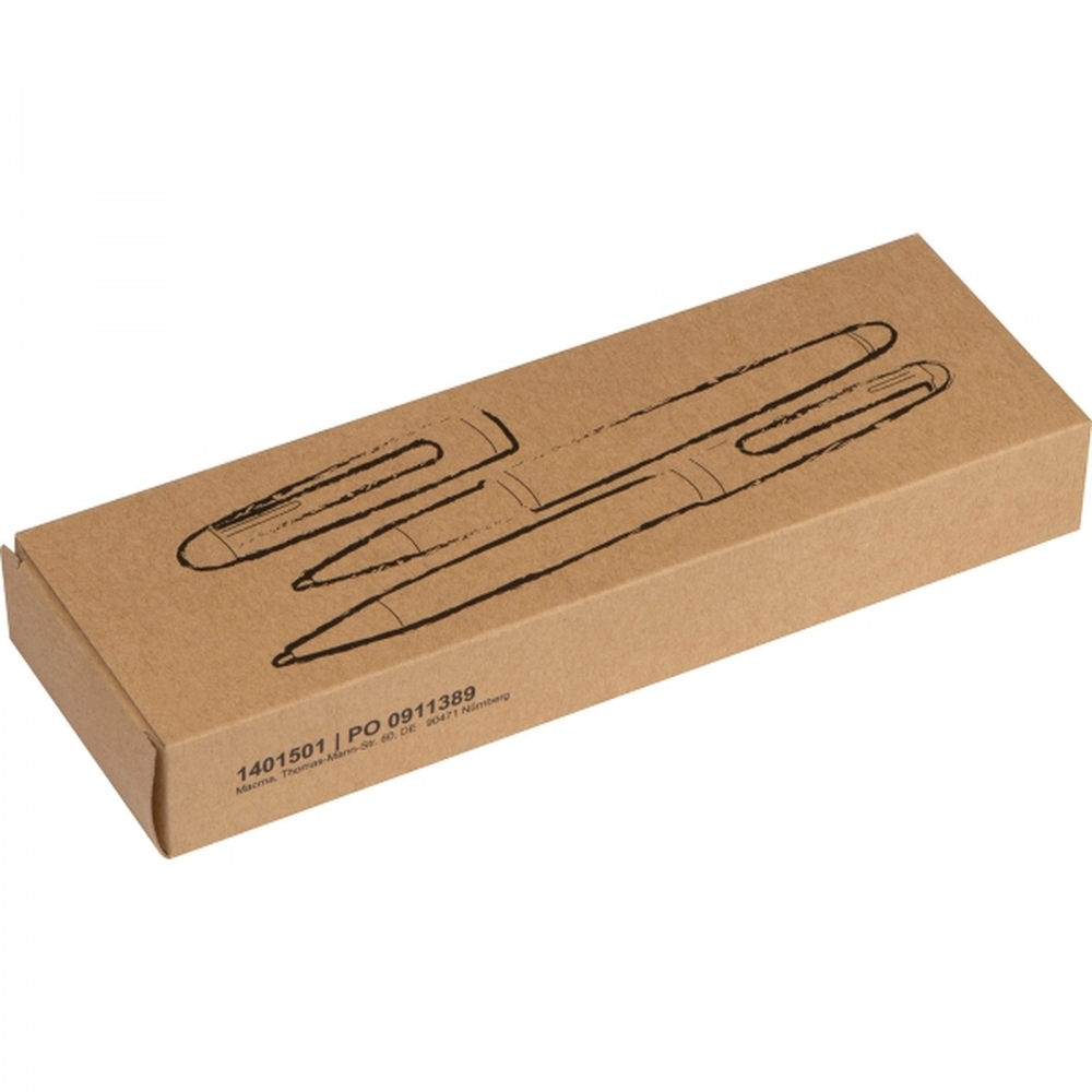 Jego funkcjonalny design pozwala nie tylko na wygodne przechowywanie przyborów piśmiennych, ale także na wykorzystanie go jako podstawki na biurko. To rozwiązanie łączy estetykę z praktycznością, sprawiając, że zestaw będzie ozdobą każdego miejsca pracy.Dzięki ekologicznym materiałom, ten zestaw to doskonały wybór dla osób, które cenią sobie elegancję, ale jednocześnie dbają o środowisko. Klasyczny charakter pióra i długopisu, w połączeniu z wysoką jakością wykonania, czyni go idealnym prezentem dla miłośników tradycyjnego pisania, biznesmenów czy studentów.Ponadczasowy styl, naturalne materiały i precyzja wykonania sprawiają, że ten zestaw piśmienny to doskonałe połączenie estetyki, funkcjonalności i ekologii.