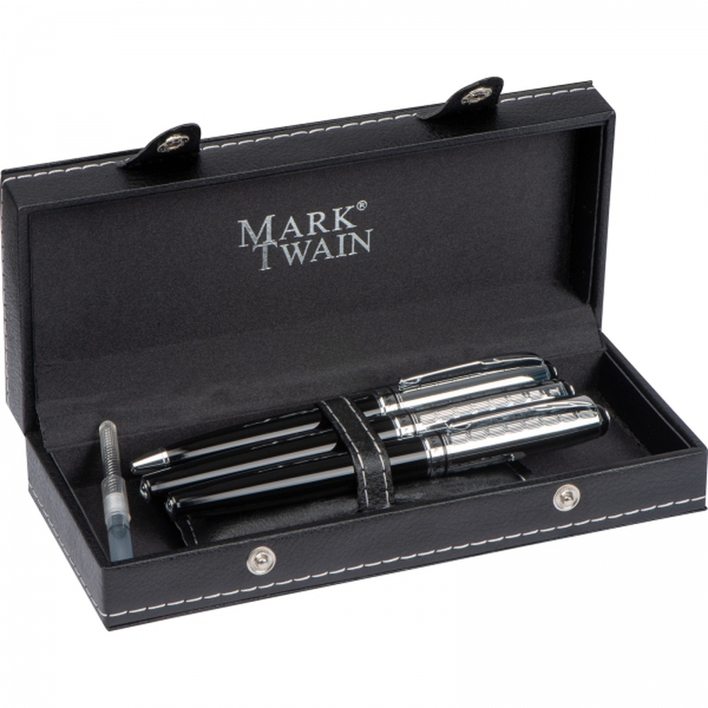 Zestaw piśmienny długopis, pióro kulkowe i wieczne marki Mark Twain to elegancka i funkcjonalna kolekcja przyborów do pisania, która zaspokoi potrzeby nawet najbardziej wymagających użytkowników. Idealny zarówno do codziennego użytku, jak i na specjalne okazje, zestaw łączy w sobie najwyższą jakość wykonania, komfort pisania i ponadczasowy design. Całość jest umieszczona w gustownym etui, co czyni ten zestaw świetnym pomysłem na prezent dla osób ceniących sobie elegancję i praktyczność.W skład zestawu wchodzą trzy różne przybory piśmiennicze: pióro wieczne, pióro kulkowe oraz długopis.