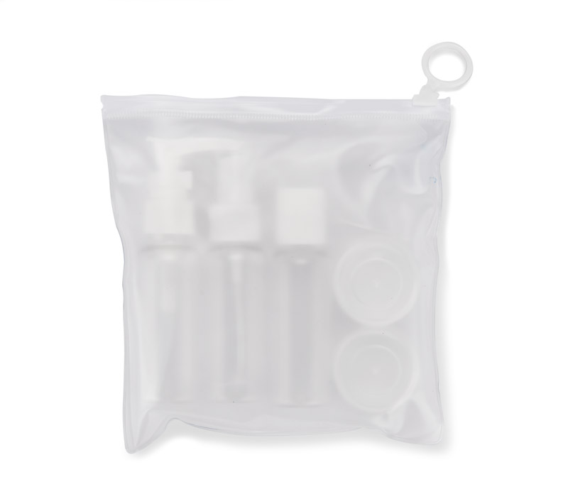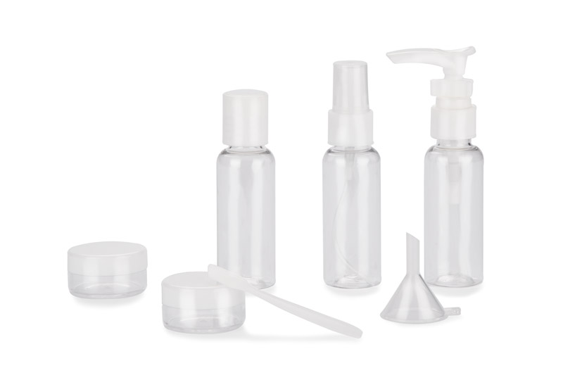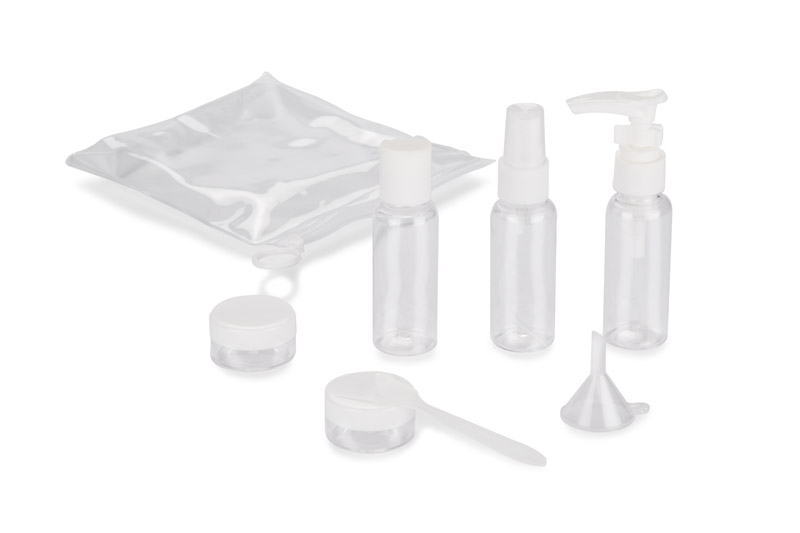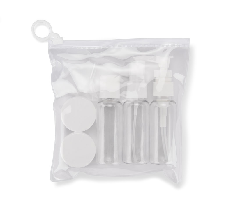 Praktyczny zestaw pojemników podróżnych AIRO umożliwia wygodne i higieniczne przechowywanie kosmetyków podczas podróży. W jego skład wchodzą: buteleczka z atomizerem, buteleczka z pompką, buteleczka z zamknięciem oraz dwa słoiczki. Dołączony lejek ułatwia precyzyjne przelewanie płynów, a łyżeczka jest idealna do przekładania kosmetyków o kremowej konsystencji. Przezroczyste pojemniki z białymi nakrętkami ułatwiają identyfikację zawartości. Zestaw zawiera także etui, z jednej strony przezroczyste, a z drugiej mleczne, zamykane strunowo. Kompaktowe rozmiary pojemników spełniają wymogi linii lotniczych.